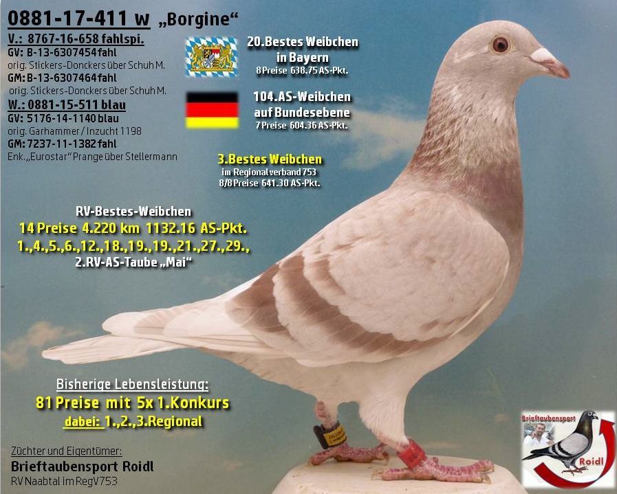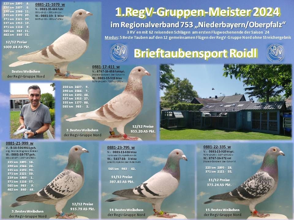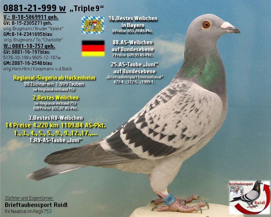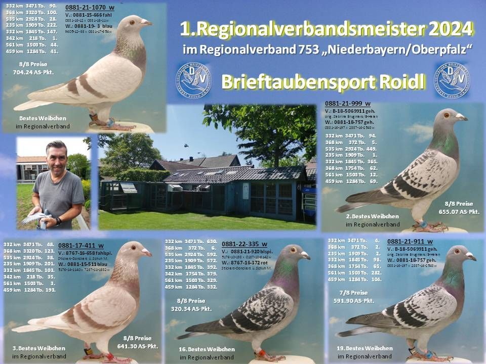 1.,2.,3.Bestes Weibchen im RegV 753 / 5.,8.Bestes jähriges Weibchen / 8.Bestes jähriger Vogel / 1.,2.,4.Beste RegV-Jungtaube