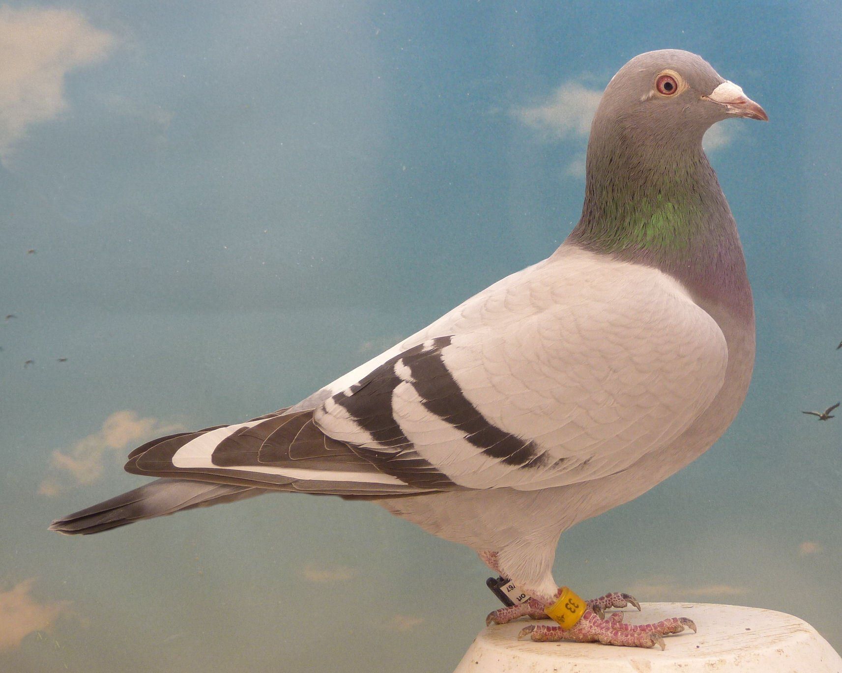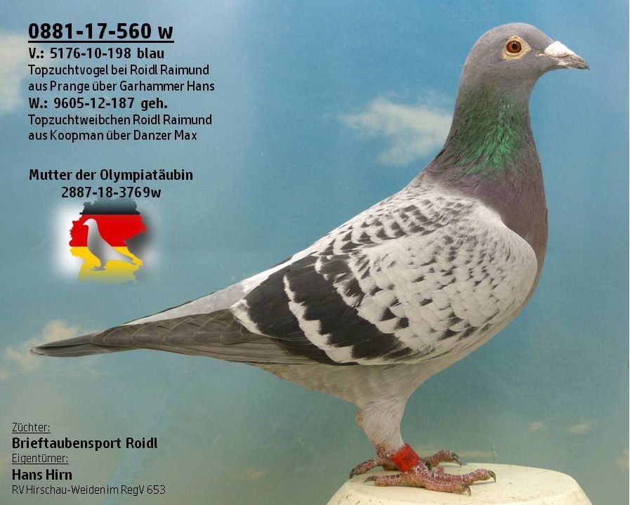9605-12- 33 x 0881-08-360wSeine Mutter war eine Vollschwester zur Olympiatäubin 64 und selbst eine hervorragende Zuchttäubin.