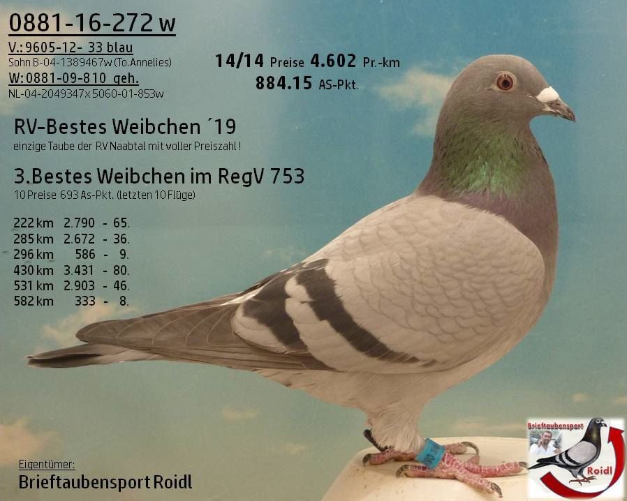 5 Jahren sage und schreibe 60 Preise geflogen und dabei 4x den Titel 2.Bestes RV-Weibchen geholt. Ihre Enkeltocher 343w holte 2019 einen Regional-Sieg ab Borg gg. 3.431 Tb.