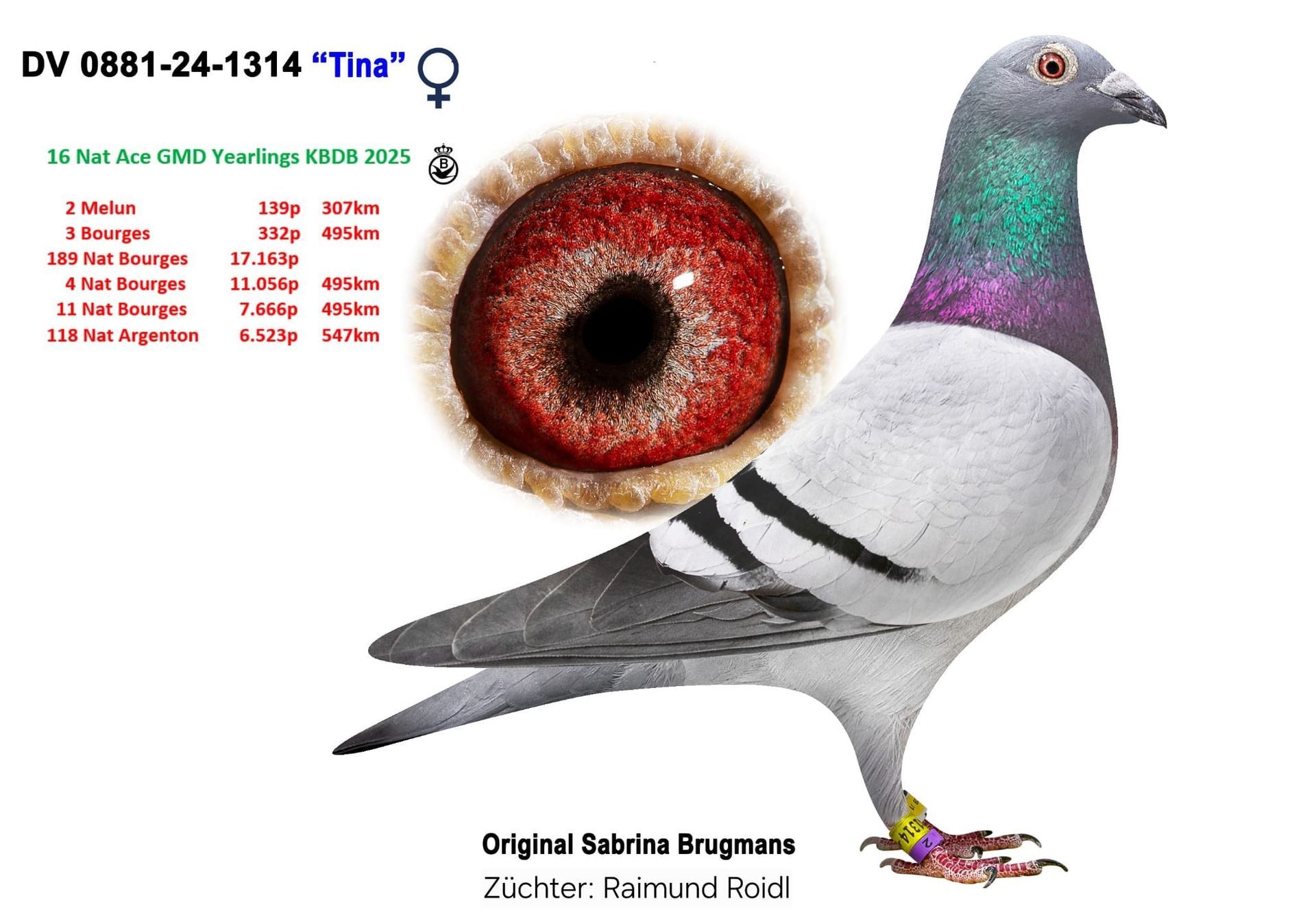 Mittlerweile züchten -11- Tauben dieses belgischen Top-Schlages und aktuell "Gouden Duif"-Gewinners 2023 bei uns und sind Eltern folgender Toptauben bei uns, mit den aktuellen Reiseleistungen allein in 2023 und 2024 :