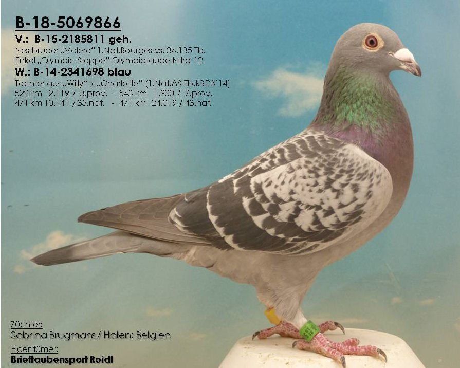 Der "866" ist ein Sohn aus dem Nestbruder "Valere", der den 1.Nat.Bourges gg. 36.135 Tb. flog !!! Die Mutter des "866" stammt aus dem Topvererber "Willy" x "Charlotte", der 1.Nat.AS-Tb. KBDB´14 !!!