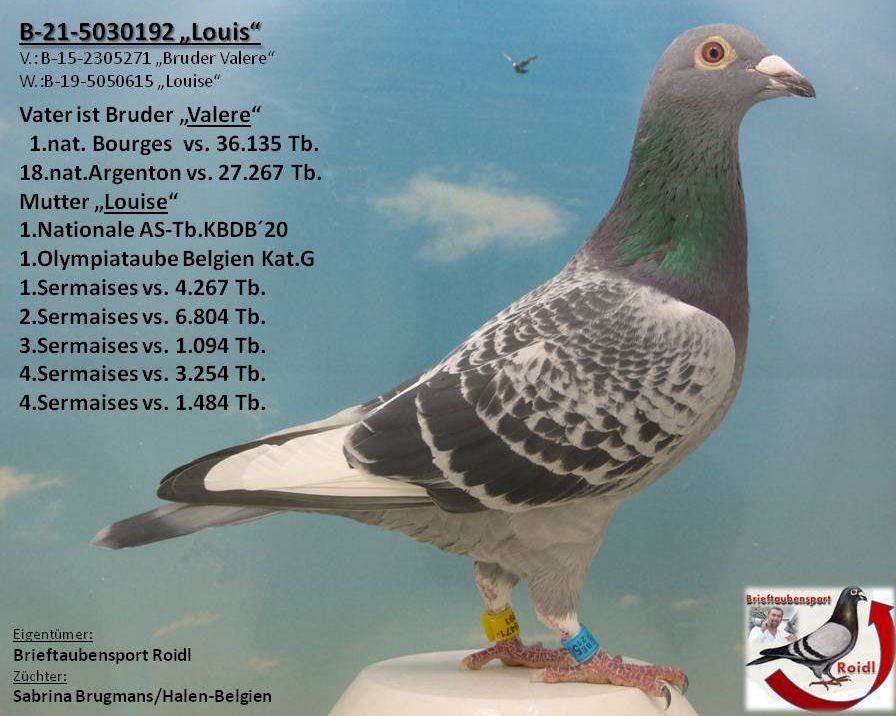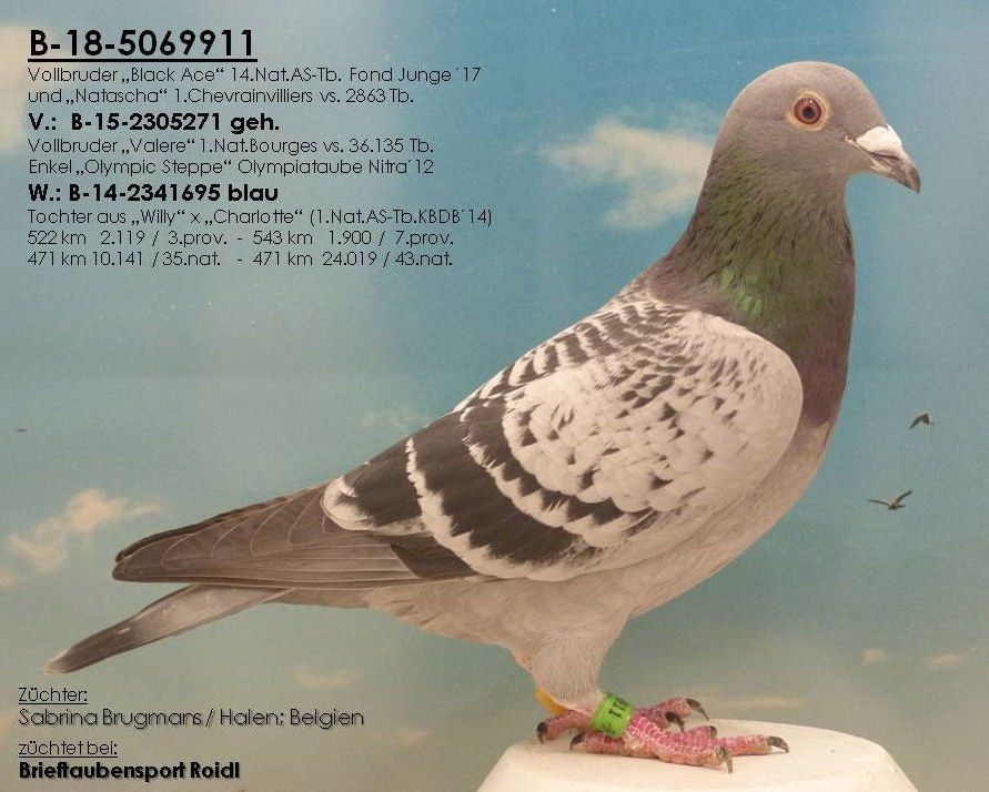 Der "911" ist ein Sohn aus dem Vollbruder "Valere", der den 1.Nat.Bourges gg. 36.135 Tb. flog !!! Die Mutter des "911" stammt aus dem Topvererber "Willy" x "Charlotte", der 1.Nat.AS-Tb. KBDB´14 !!! "911" ist Vollbruder zu "Black Ace"