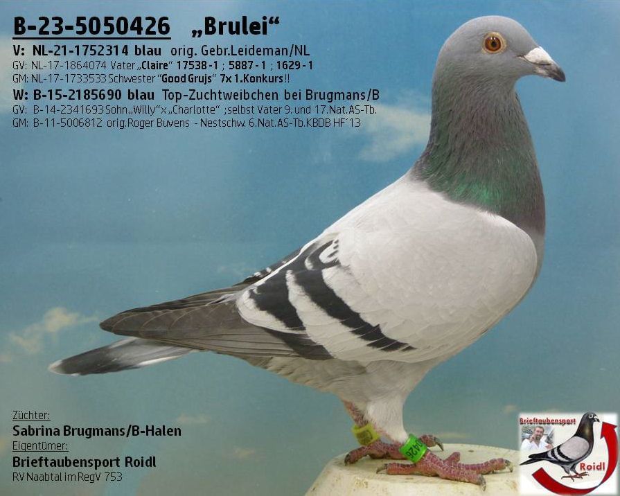 Der "426" kommt aus einem orig.Vogel der Gebr.Leideman/NL aus dessen Top-Linien. Sein Vater ist ein Bruder "Claire", gezogen mit einer Schwester der "Good Grijs" !