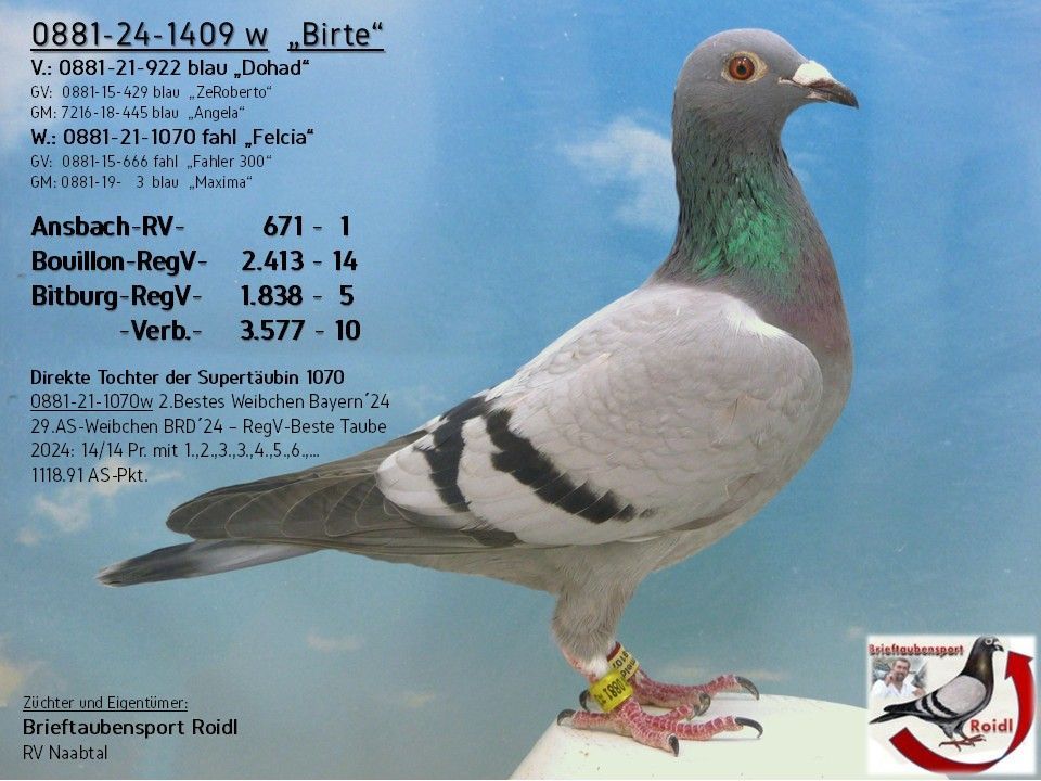 0881-24-1409w Tochter der 0881-21-1070w 2.Bestes Weibchen Bayern´24 - Regionalbeste Taube - ´24: 14/14 Preise mit 1118.91 AS-Pkt.
