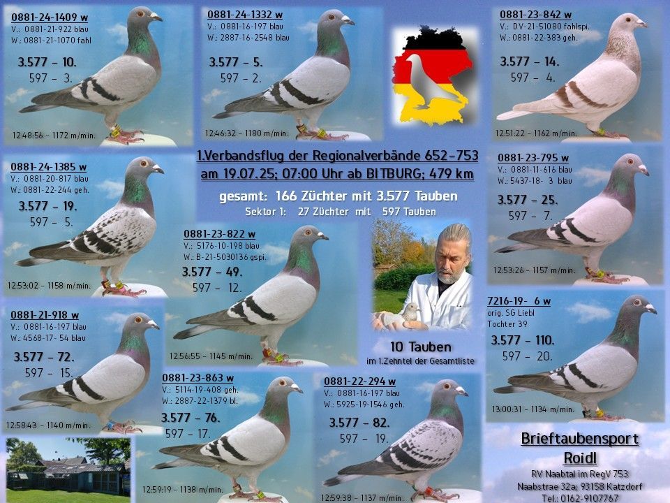 Bei diesem sehr anspruchsvollen Flug mit Kopfwind, konnten wir in der großen Liste von 166 Züchtern mit 3577 Tauben, 10 Tauben im 1.Zehntel platzieren. Beginnend mit dem 5.,10.,14.,19.,25.,... .In der Sektorenliste war es gegen 597 Tb. der 2.,3.,4.,5.,7. und insgesamt 13 Tb. bis zum 27.Konkurs.