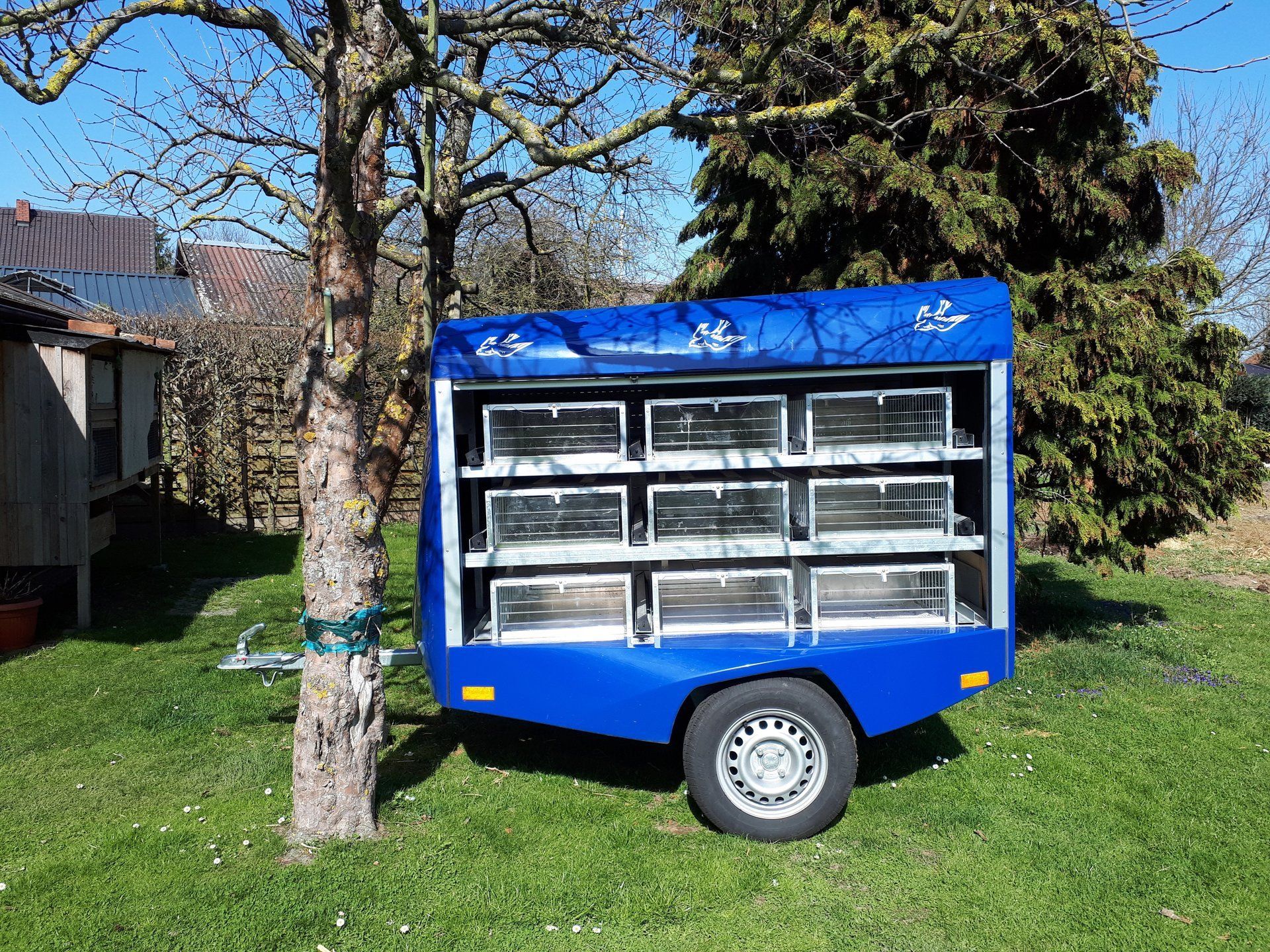 Während der gesamten Alttaubensaison sitzen am Flugtag die Jungtauben im Anhänger und werden so an die Boxen gewöhnt.